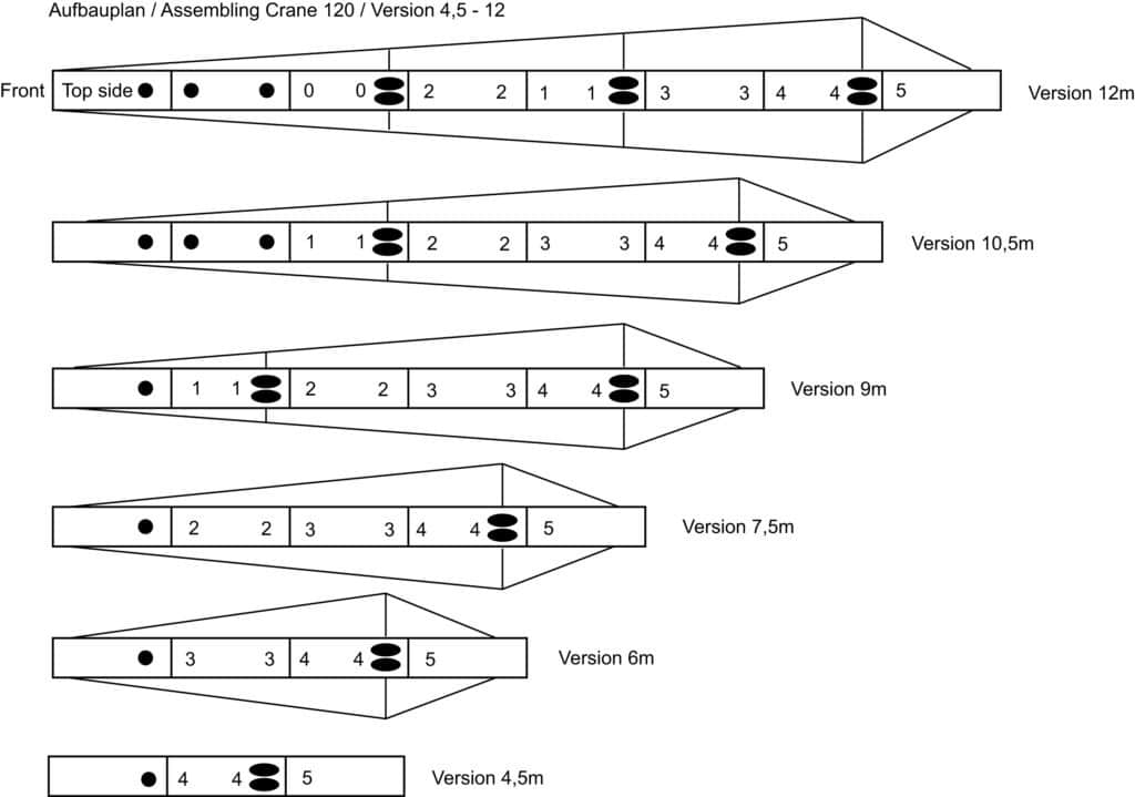 This page consists of all needed technical data and specs for Crane 120. You can find all technical specs and details, including payloads, counterweights, crane arm length and height, weights of all three Versions of Crane 120: Version 9m, Version 10,5m and Version 12m and also access the downloadable materials for Crane 120: User Manuals, Brochures and Main catalogue